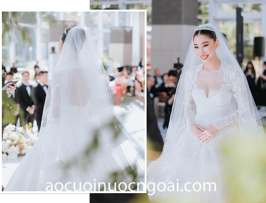 Xuất hiện lộng lẫy như một nàng công chúa, cô dâu Uyen Ho tự tin toả sáng trong chiếc áo cưới làm lễ thiết kế riêng đến từ nhà mốt Meera Meera Fashion Concept. Tác phẩm váy cưới chế tác trên nền chất liệu satin thượng hạng tạo nên phom dáng sắc nét cùng đuôi váy xoè dài lộng lẫy; phối hợp ấn tượng cùng thân áo tay dài độn vai được trang trí thủ công, khảm đá pha lê vô cùng tinh xảo.