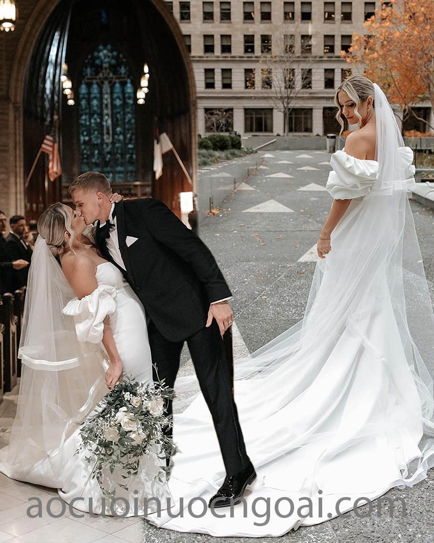 Off-the-shoulder sleeve wedding gown is ideal for the bride seeking a glamorous and romantic bridal look. This statement-making element add an unexpected touch of elegance, charm contributes to your unique and memorable appearance.