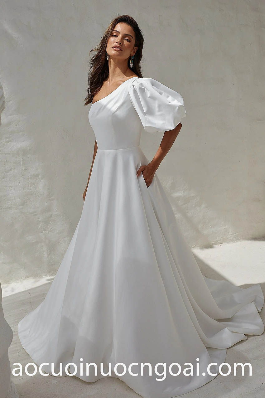 If you want to keep your bridal look fresh and contemporary with a dash of individuality, asymmetrical one shoulder sleeve wedding gown is a sophisticated choice that sure to leave a lasting impression and fit all kinds’ celebrations.