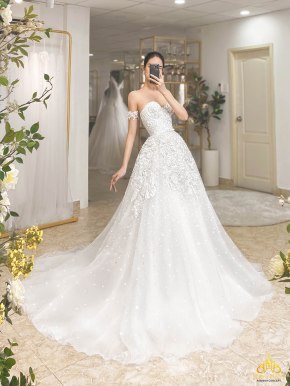 ÁO CƯỚI CÔNG CHÚA TÙNG LƯỚI TRỄ VAI THÂN REN SANG TRỌNG. MÃ MM4103