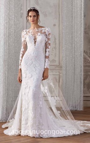 VÁY CƯỚI ĐUÔI CÁ TAY DÀI THÊU REN ĐÍNH ĐÁ NN5722