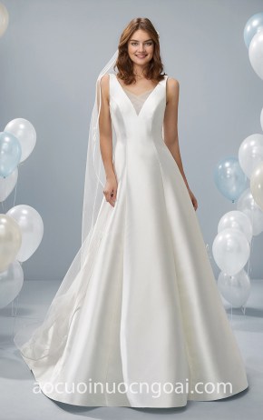 ĐẦM CƯỚI SATIN CHỮ A XẺ NGỰC LÓT LƯỚI KÍN ĐÁO NN5886