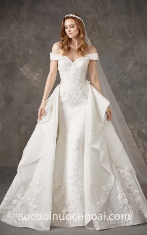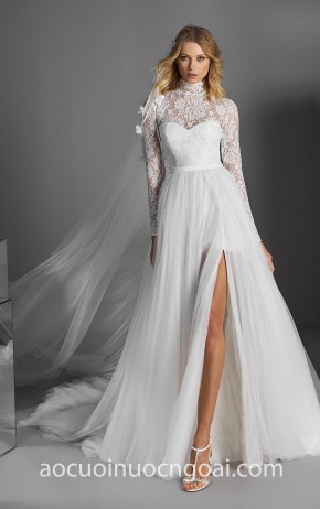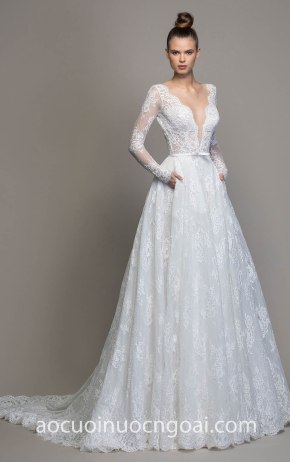 ÁO CƯỚI CHỮ A XẺ NGỰC SÂU ĐÍNH REN HOA NN7655
