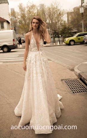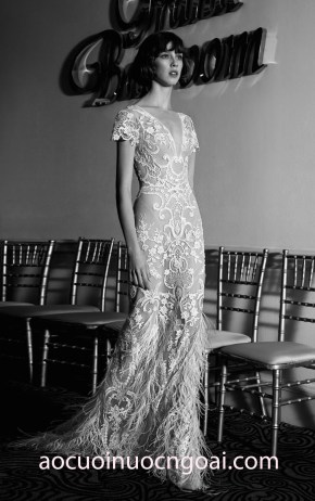 ÁO CƯỚI ĐUÔI CÁ XUYÊN THẤU THÊU REN ĐÍNH LÔNG VŨ NN2746
