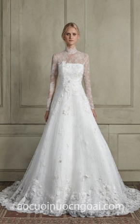 ÁO CƯỚI CHỮ A REN CỔ CAO TAY DÀI ĐIỂM HOA 3D NN7945