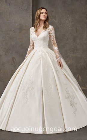 ÁO CƯỚI CÔNG CHÚA SATIN TAY DÀI ĐẮP REN LỘNG LẪY NN7686