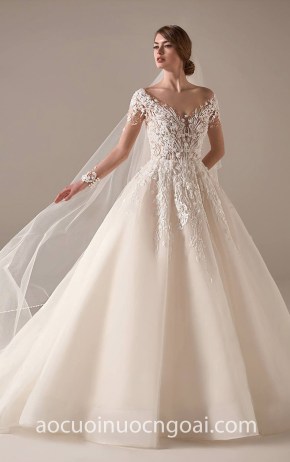 ÁO CƯỚI CÔNG CHÚA LƯỚI TRỄ VAI REN ĐÍNH ĐÁ NN7766